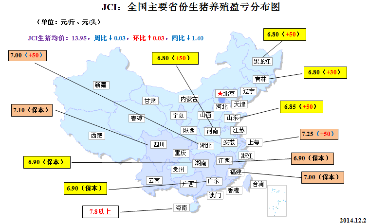 來自中國農(nóng)業(yè)部最新發(fā)布的統(tǒng)計(jì)報(bào)告--《2014年11月第2周(總第46周)畜產(chǎn)品、飼料集市價(jià)格》顯示,截至11月12日,全國生豬市場均價(jià)在14.10元/公斤,仔豬均價(jià)為21.51元/公斤,豬肉均價(jià)為23.19元/公斤,較10月均值分別下跌2.22%、8.19%和1.75%。盡管11月份我國生豬、仔豬和豬肉(白條肉)市場價(jià)格呈現(xiàn)全面回調(diào)格局,但是由于國內(nèi)豆粕、玉米包括相關(guān)飼料原料成本近來明顯回落,生豬價(jià)跌勢相對于飼料成本降幅較為溫和,全國大多數(shù)地區(qū)的養(yǎng)殖戶(場)仍然維持保本或微利狀態(tài)。如前文所述,進(jìn)入12月份我國生豬市場依然存在需求推動(dòng)型的反彈空間。